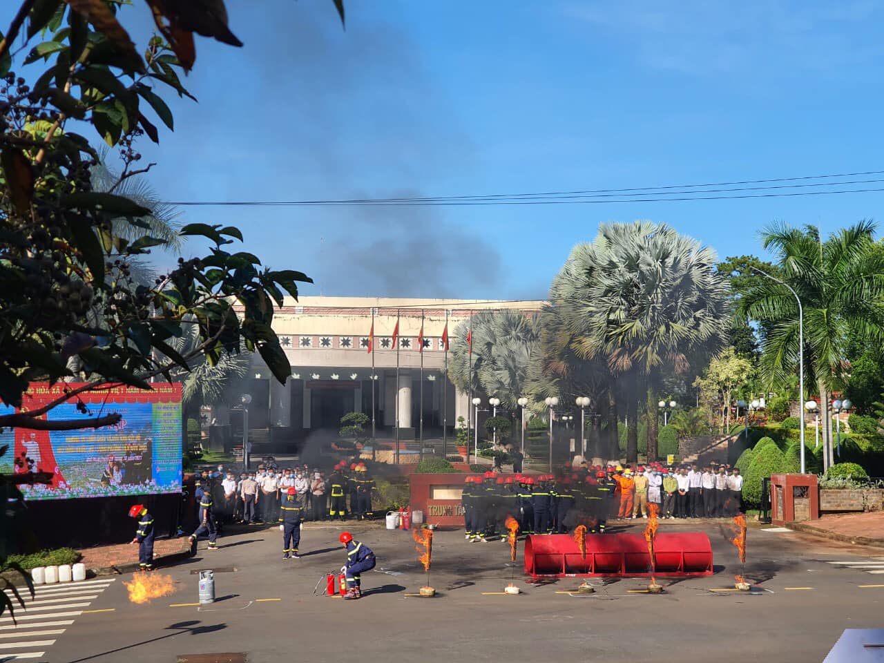 Tình huống giả định, có đám cháy xảy ra tại tầng hầm để xe của Trung tâm hội nghị tỉnh (Nơi thường xuyên diễn ra các sự kiện chính trị, văn hóa của tỉnh với sức chứa khoảng gần 2000 người), sau đó nhanh chóng lan ra toàn bộ khu vực.